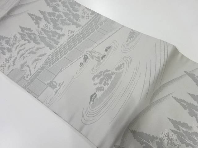 <名古屋帯サイズ>(単位:cm)太鼓部分長さ114太鼓部分幅30.5前部分長さ254前部分幅15.2 時代 現代(1989 - ) 状態 よい 素材 正絹 色目 グレー 【商品説明】多少の薄アクと糊アクがあります。