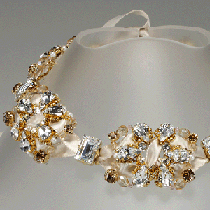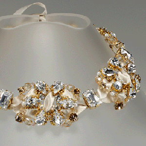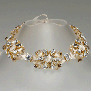 ・ティアラ/クラウン ・ヘッドドレス ・ボンネ ・カチューシャ【 ブライダルネックレス 販売 】 ■ 素材:スワロフスキーラインストン/スワロフスキークリスタル/ビーズサテンリボン(MOKUBA) ■ 色:ゴールド系 ■ サイズ:首回り 約37cm / アジャスターで最長43cmまで延長可リボンの垂れ部分の長さ:左右各約50cm / モチーフ部分:縦約3.3cm 横約5cm ■ 原産地:日本 ■備 考:お届けまでに10日〜14日ほどお時間を頂戴しております。