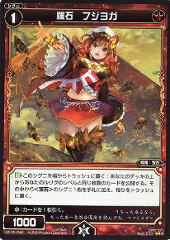 《羅石らせき フジヨガ》 † カード名 羅石 フジヨガ [ラセキフジヨガ] 色:赤 カードタイプ :シグニ クラス:精羅:宝石 レベル:1 パワー 1000 限定条件:- 【起】このシグニを場からトラッシュに置く:あなたのデッキの上からあなたのルリグのレベル:と同じ枚数のカードを公開する。